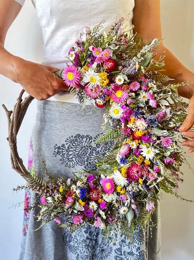 This is the most popular workshop where you create your own colourful long-lasting wreath exposing beauty of the base, hand-twisted from vines that lace freely trees and forest on our property.